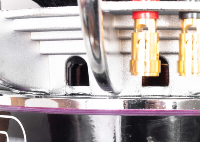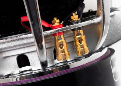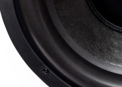 โครงลำโพงแข็งแกร่งด้วยโลหะหล่อขึ้นรูปชุบ Chrome แวววาวทั้งตัวด้วยโครงเงา-เหล็กหล่อ ดีไซน์ช่องระบายความร้อนไว้โดยรอบตัวโครง ขนาดหน้ากว้างซับ 12 นิ้ว(32ซม.) วอยซ์คอยล์คู่ 4+4 โอห์ม กรวยกระดาษอัดรีดขึ้นรูป Non-Press Paper ที่เคลือบน้ำยาไว้อย่างดี ความเพี้ยนต่ำ เพื่อคุณภาพเสียง คือให้เบสเป็นตัวเป็นตนมีเนื้อมีหนังไม่ใช่ดังสะท้านหูอย่างเดียว ดัสท์แค็ปทรงนูนก็เคลือบผิวอย่างดี ป้องกันวอย์คอยล์ได้อย่างสบายใจ และทำหน้าที่ร่วมกับกรวยให้เบสกระชับชัดเจน ขอบเซอรร์ราวด์ยางขนาดใหญ่คุณภาพสูง ไม่หลุดร่อนง่าย ยืดหยุ่นตัวได้ดีและรับมือกับสภาวะการทำงานระดับขาโหด-โปรดปรานเบส…