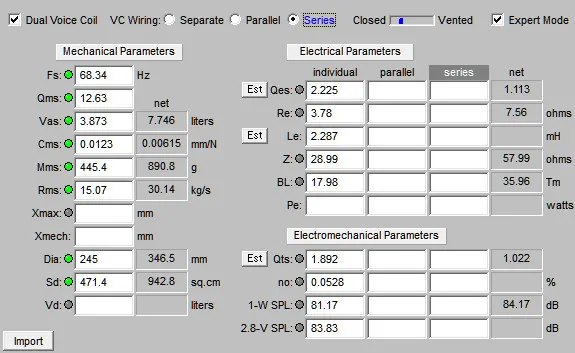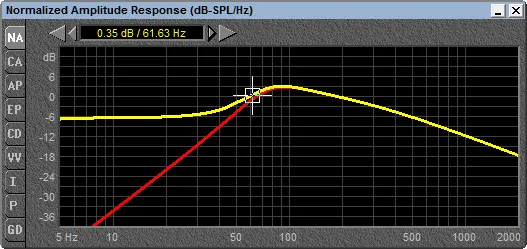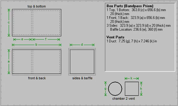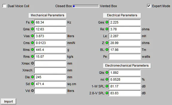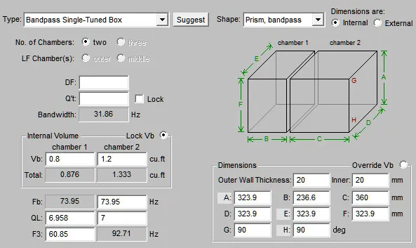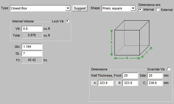 จากการคำนวณค่าพารามิเตอร์ของโปรแกรม BassBox Pro ที่ชี้ตัวเลข EBP ออกมาที่ 31 อันเป็นตัวเลขที่บ่งบอกว่าต้องการคบหากับตู้ปิด…แล้วโปรแกรมก็คำนวณตู้ปิดออกมาให้…ซึ่งมีขนาดไม่ใหญ่นัก…ปริมาตรแค่ 0.87 ลบ.ฟุต…ได้เรโซแนนซ์ช่วยอีกหน่อย…นั่นก็เพียงพอแล้วที่จะพวยพุ่งลูกเบสที่ดัง…ใหญ่…หนักแน่น และทรงพลังออกมาในระดับ 62 Hz…