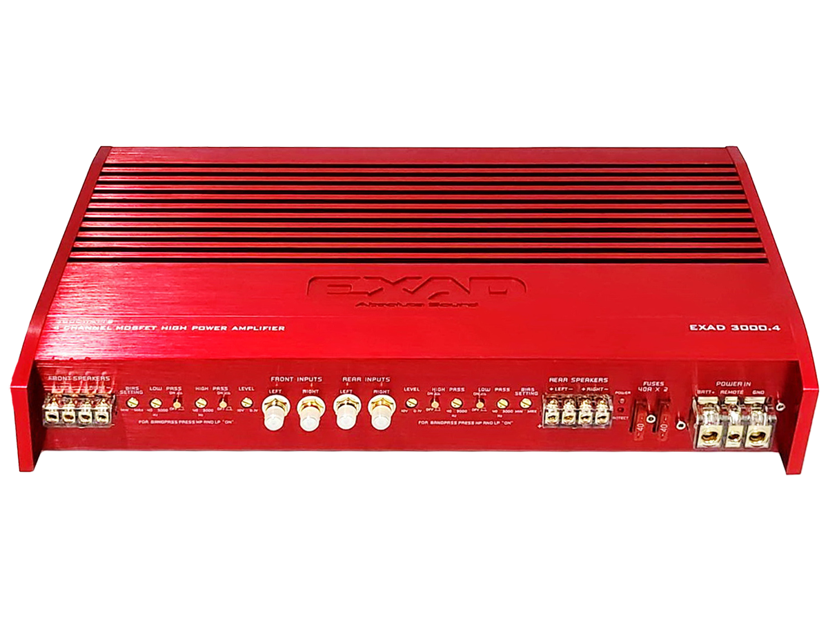 สำหรับเจ้าตัวเพาเวอร์แอปม์ตัวนี้ เป็นรุ่นใหญ่ให้กำลังขับเยอะมากสำหรับเพาเวอร์แอมป์ในคลาส ab โดยมีชื่อรุ่นว่า EX3000.4 มีหน้าตา หรูหรา และดุดันขนาด 420 X 225x 68 mm. แข็งแกร่ง ด้วยโครงสร้าง Chassis แบบอลูมิเนียมขึ้นรูปสีแดงทั้งตัว