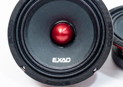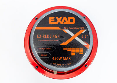 EXAD RED 6.4 GN ถือเป็นลำโพง Mid-Range หรือลำโพงเสียงกลางขนาด 6.5 นิ้วที่ออกแบบมาได้สะดุดตายิ่งนัก ตัวโครงลำโพงทำมาจากโลหะปั๊มขึ้นรูป 4 ก้านชุบสีแดงสวยงาม ปั้มด้วยLOGO EXAD บนก้านโครงสวยงามโดดเด่น กรวยลำโพงทำด้วยกระดาษอัดรีดขึ้นรูป Cloth Edge And Non-Pressed Paper Cone แล้วล้อมด้วยขอบเซอร์ราวด์ผ้าลอนคู่ M Type มุ่งเน้นให้ตอบสนองเสียงกลางได้อย่างชัดเจน และเป็นธรรมชาติ พร้อม Phase Plug อลูมิเนียมเคลือบสีแดงโดดเด่นตรงกลางกรวยอย่างดี ส่งถ่ายพลังมาจากอลูมิเนียมวอยซ์คอยล์ความต้านทาน 4 โอห์ม มีความไวต่อเสียง 94 dB สามารถรองรับกำลังขับได้สูงสุดถึง 600W กันเลยทีเดียว