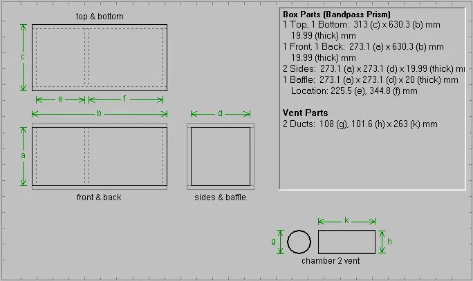 กับตู้แบนด์พาสนั้น…จากการคำนวณโดยเน้นให้ติดตั้งได้อย่างไม่เทอะทะก็ต้องใช้ตู้เปิดใบหน้าสัก 0.9 ลบ.ฟุต พร้อมวางท่อขนาด 4 นิ้ว ยาว 10.35 นิ้ว…ส่วนตู้ปิดใบหลังนั้นตีสัก 0.6 ลบ.ฟุตกำลังดี ได้ตู้แบนด์พาสที่ตอบสนองความถี่ได้ 55-94 Hz ปรับจูนอย่างลงตัวที่ 57 Hz ได้ลูกเบสที่หนักแน่น ลึกดังสนุกสนานมันส์สะท้านทรวงกันทีเดียว…